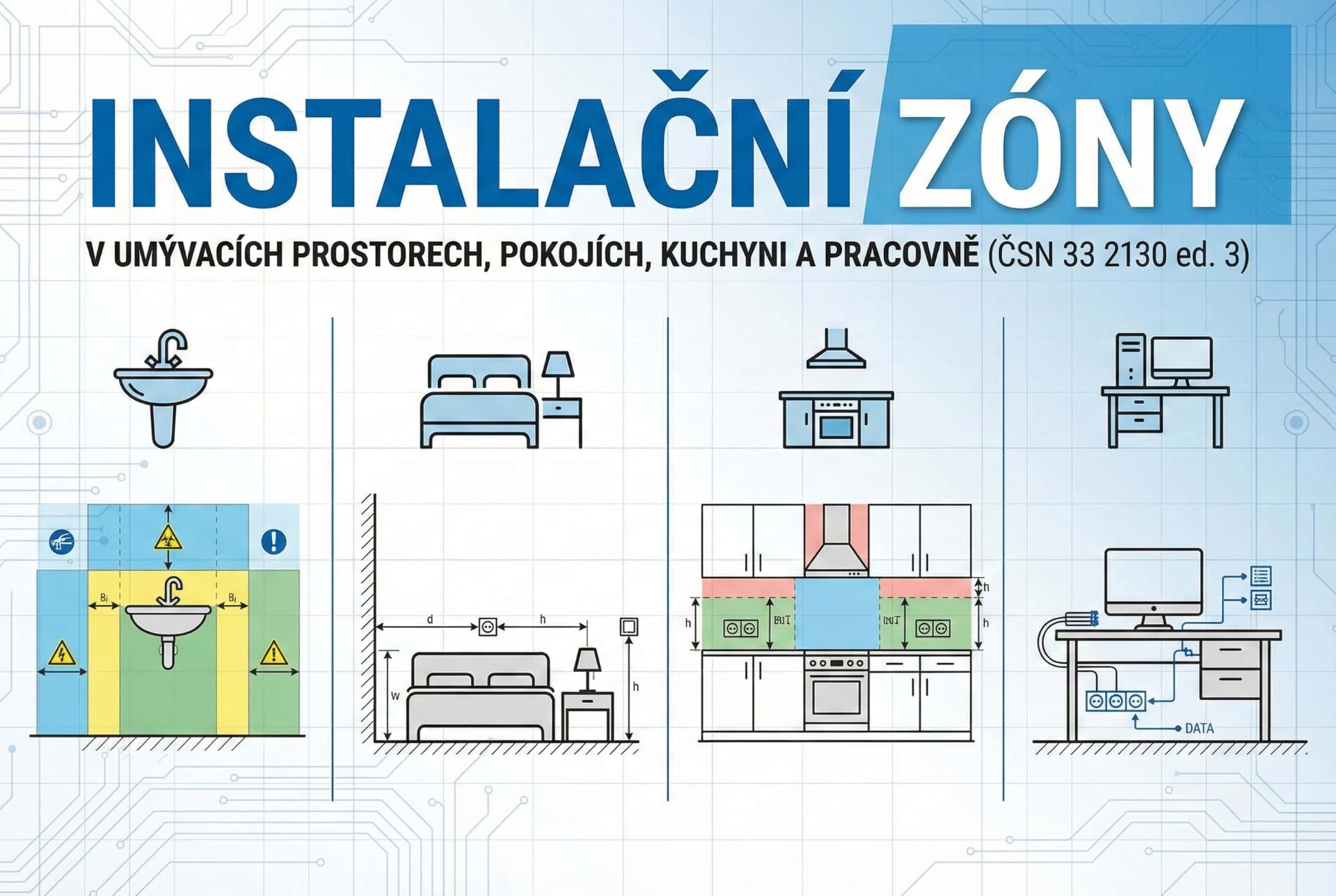 Instalační zóny v umývacích prostorech, pokojích, kuchyni a pracovně